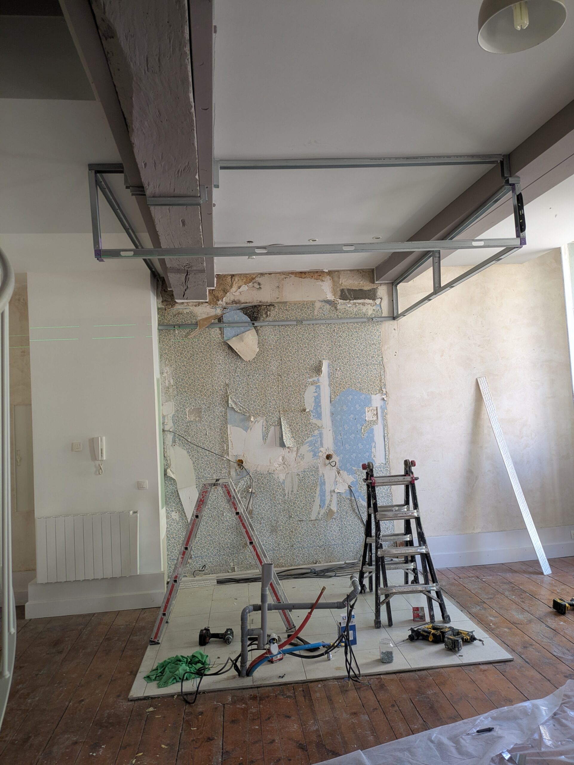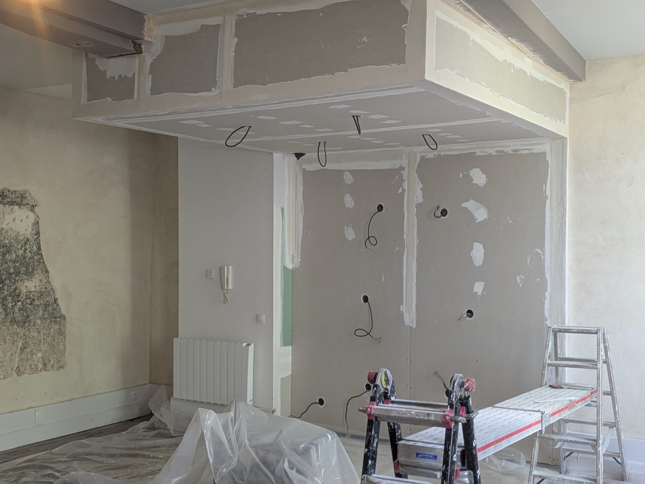 Réalisation d’un faux plafond pour un changement de cuisine et rafraîchissement complet du séjour.